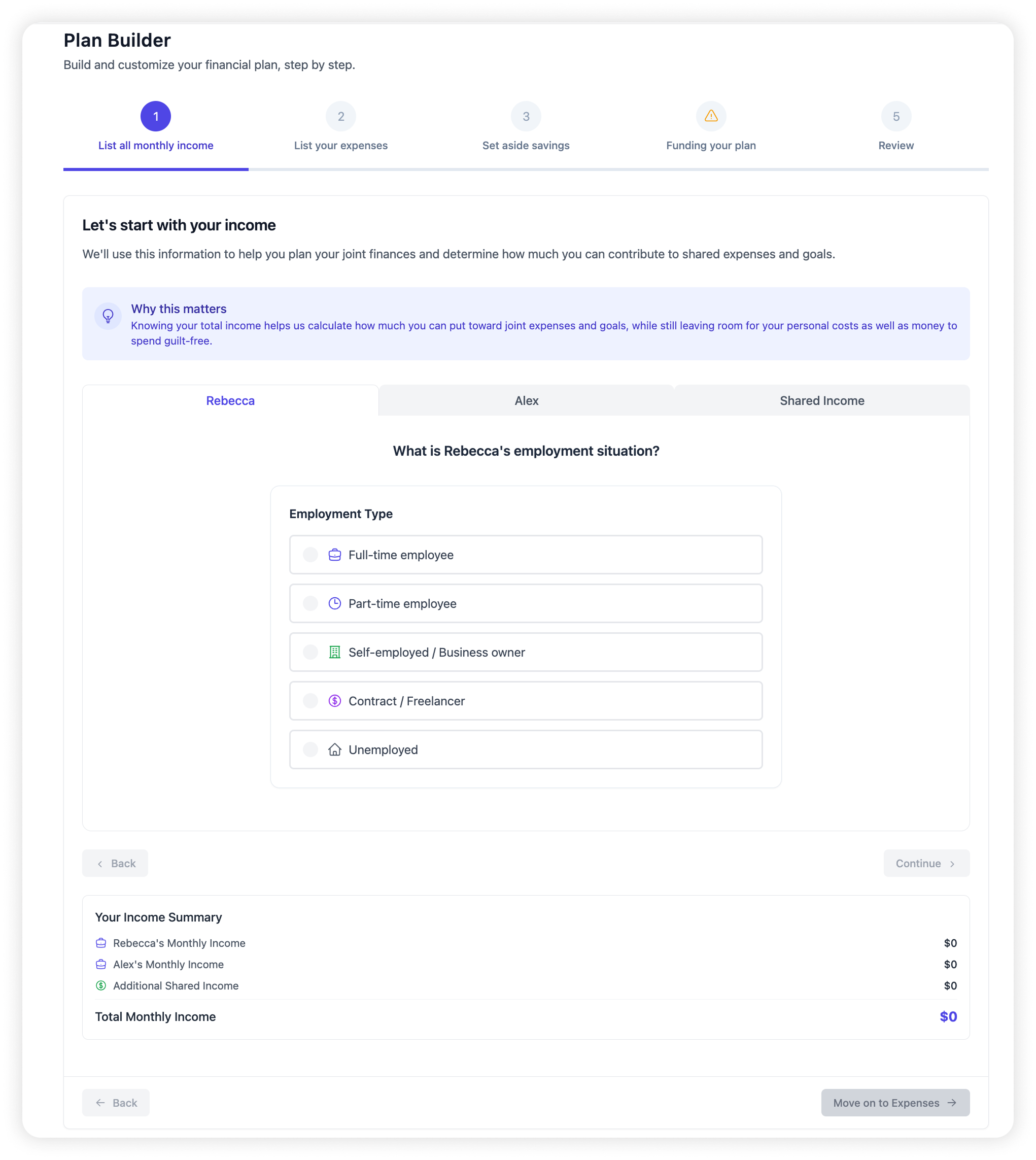The new JoyFi setup flow adapts to how you manage money together. Think of it as a guided wizard that walks you through the key pieces of your plan step by step, providing tailored examples and explanations along the way.